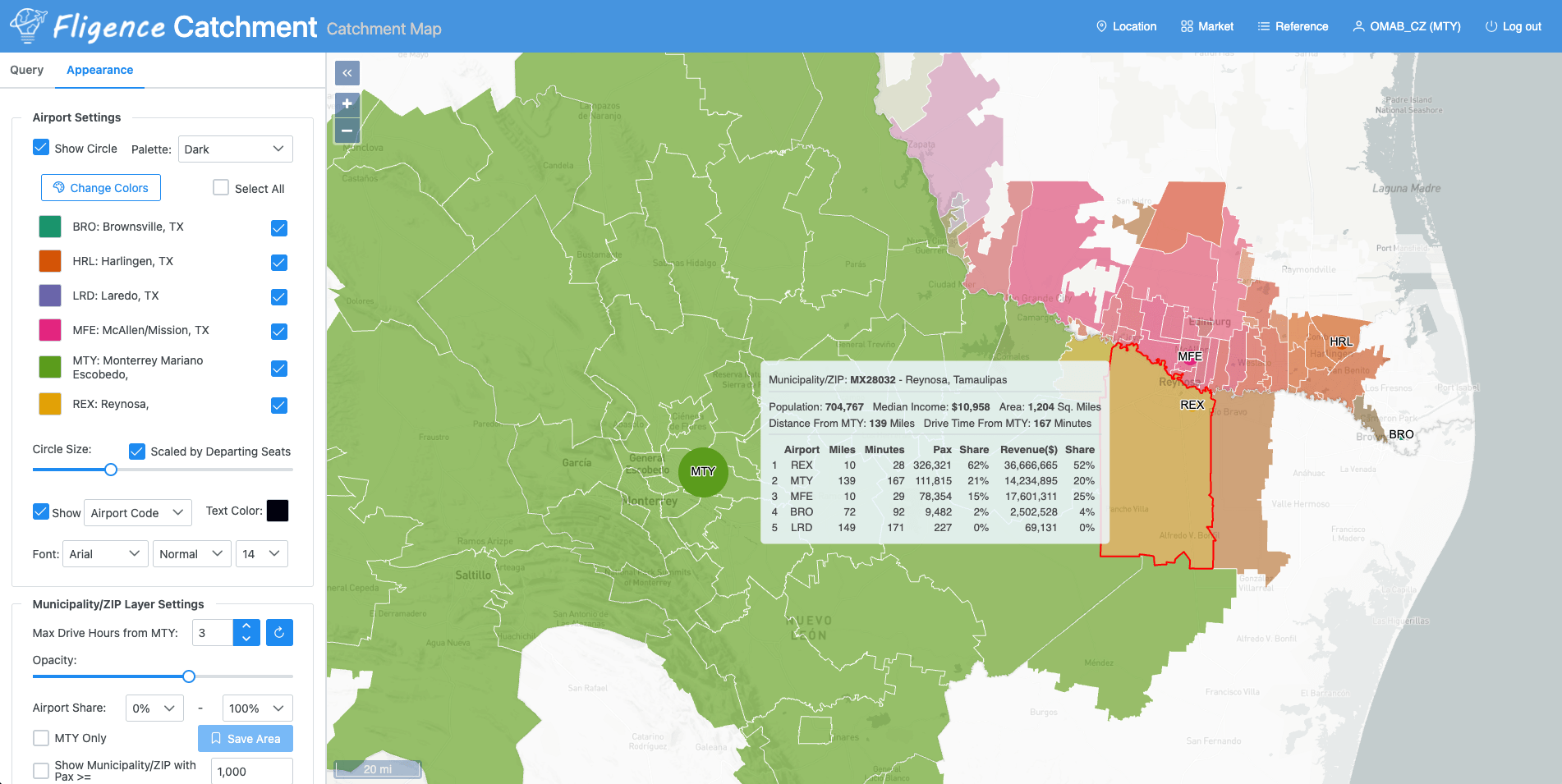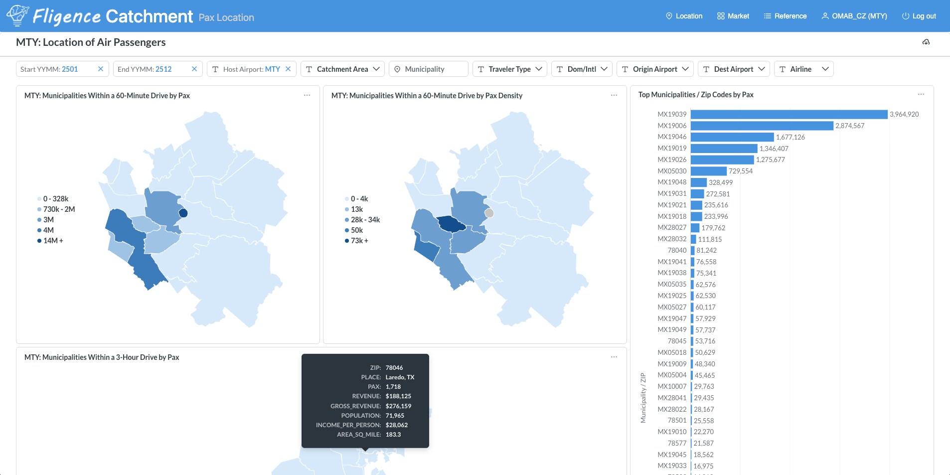 Using insights from Fligence Catchment, Mexican airports located along the U.S.–Mexico border can move beyond traditional domestic targeting and instead identify exactly where U.S. travelers originate, how they travel, and which competing airports they currently use. By leveraging ZIP-level origin–destination data, mobile movement patterns, and leakage analysis, airports can pinpoint high-value U.S. catchment pockets—such as border cities or secondary metropolitan areas—where travelers are already willing to cross the border for better fares or connectivity. These insights allow airports to quantify “leakage” from U.S. airports (e.g., passengers driving to Mexican airports for international flights), enabling highly targeted marketing campaigns, airline incentives, and route development strategies tailored to those specific micro-markets. For example, identifying underserved O&D demand from U.S. ZIP codes can support new cross-border routes or increased frequencies, while understanding behavioral patterns—such as price sensitivity or willingness to travel longer distances—helps position the Mexican airport as a competitive alternative.