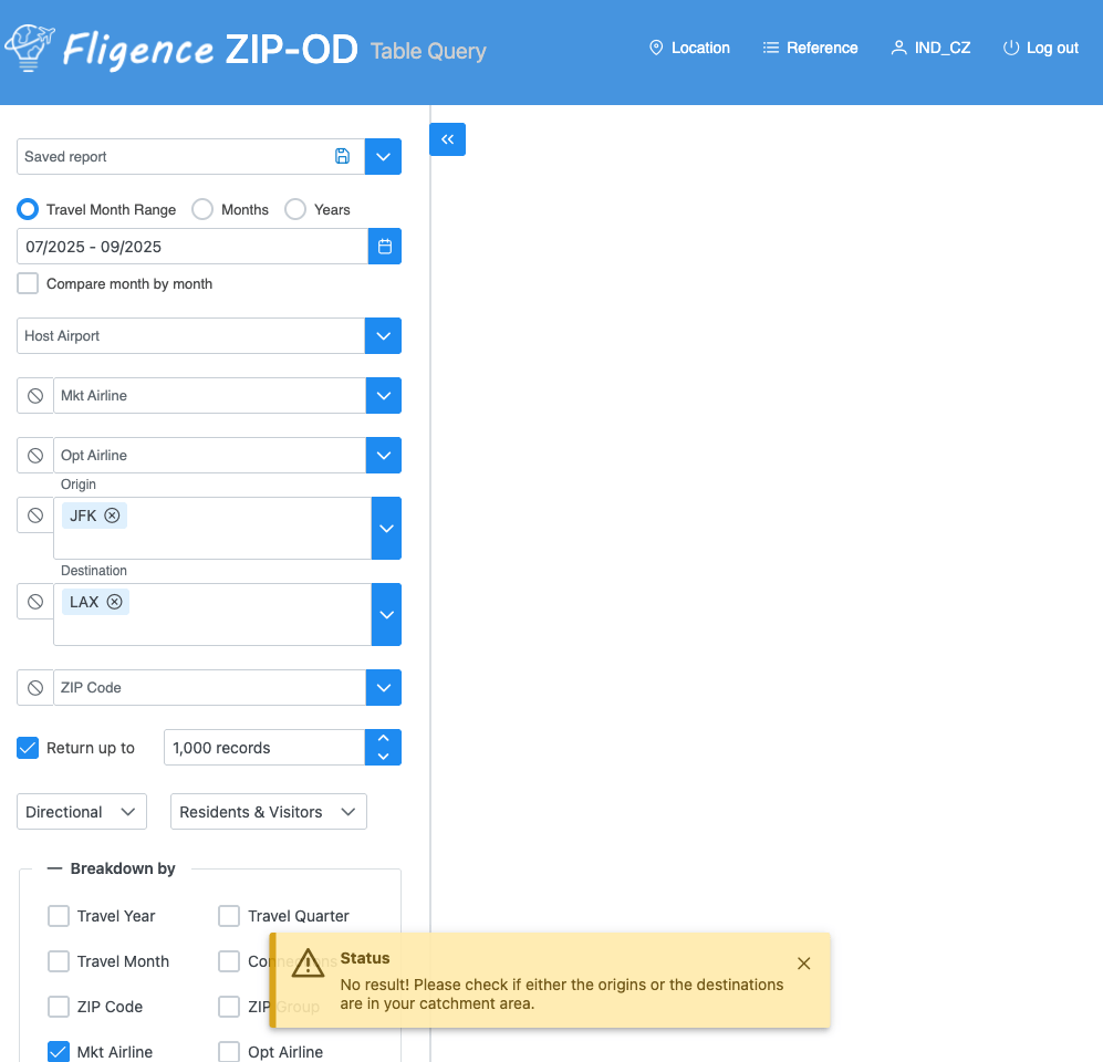 If you apply filters where both the origin and destination fall outside your area, the system will display the message: “No result! Please check if either the origins or the destinations are in your catchment area.”