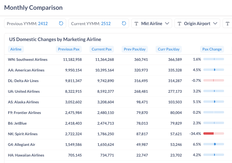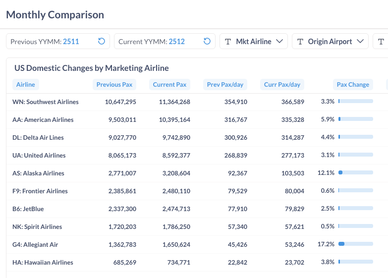 From December 2024 to December 2025, most U.S. airlines recorded year-over-year growth. Allegiant (G4) led with a 6.5% increase, followed by Alaska (AS) and American (AA) at 5.1% and 4.5%, respectively. In contrast, Spirit (NK) remained the most notable decliner, with traffic down 34.4% compared with the same month last year.