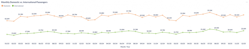 U.S. domestic passenger traffic reached 54.2 million in December 2025, rebounding from 50.1 million in November and edging 1.2% above December 2024’s 53.5 million. International volumes showed a stronger seasonal pickup, rising from 19.1 million to 22.6 million over the same period.