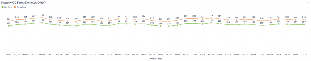 Domestic airfares rose modestly in December 2025, with the average gross fare increasing from $216 in November to $218, while the average net fare edged up from $185 to $187.