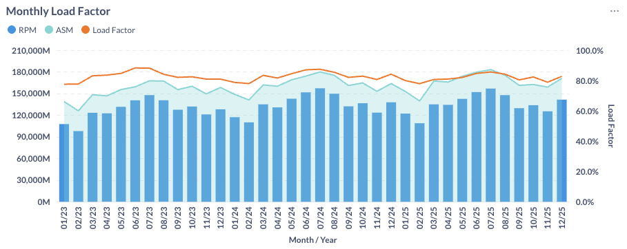 In December 2025, both Available Seat Miles (ASM) and Revenue Passenger Miles (RPM) increased month over month. The average load factor for major U.S. airlines improved to 82.8%, though it remained below the 84.2% recorded in December 2024 (see Figure 3).