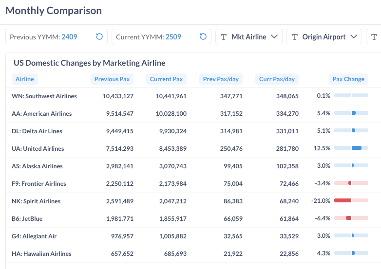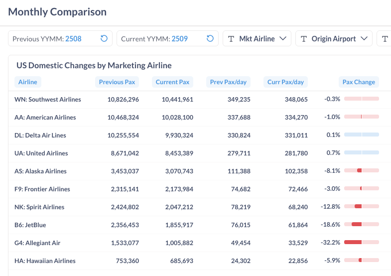 According to initial true O&D level data from FlightBI released this week, total U.S. domestic air travel declined in September 2025. International travel volumes also saw an slow-down. Additional, average airfares increased during the same period.