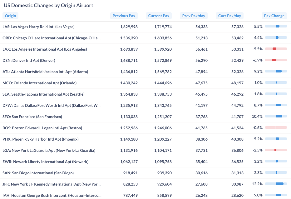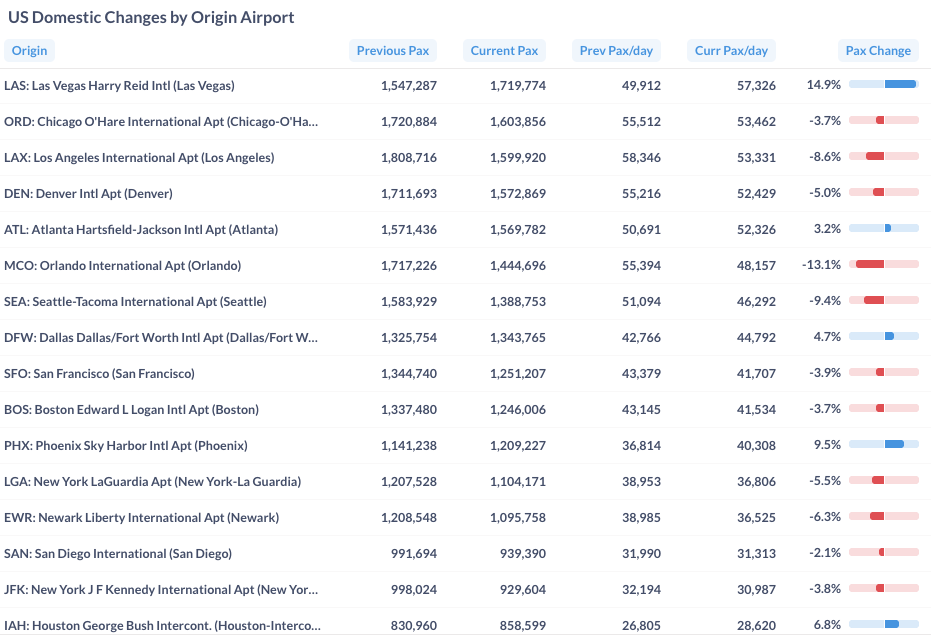 Many airports reported passenger decline in September 2025. Orlando (MCO), Seattle (SEA) and Los Angeles (LAX) led a decline of 13.1%, 9.4%, and 8.6%, respectively. However, Las Vegas (LAS), Phoenix (PHX) and Houston (IAH) saw a growth of 14.9%, 9.5% and 6.8%.