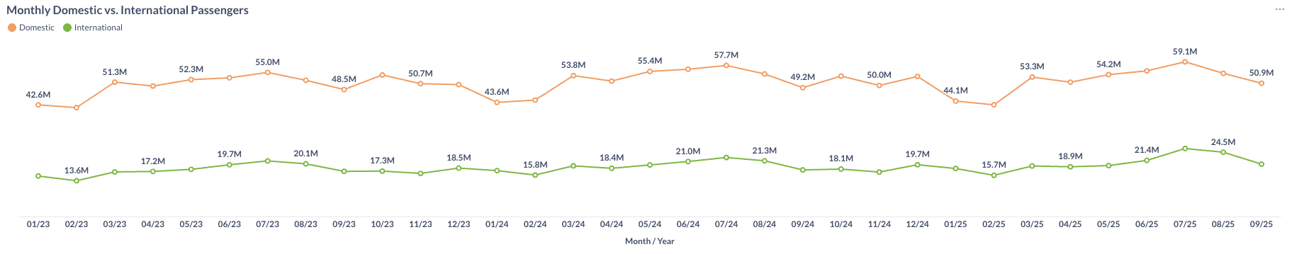 In September 2025, U.S. domestic passenger traffic decreased to 50.9 million, down from 54.7 million in August and 3.5% higher than September 2024’s 49.2 million. International passenger volumes also dropped, decreasing from 24.5 million in August to 20.0 million in September.