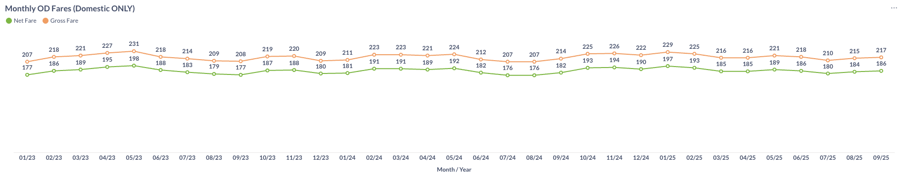 Domestic airfares rose in September 2025, with the average gross fare increasing from $215 in August to $217, and the average net fare increasing from $184 to $186.