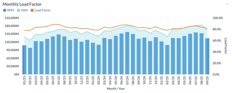 In September 2025, both Available Seat Miles (ASM) and Revenue Passenger Miles (RPM) declined month over month. The average load factor for major U.S. airlines decreased at 81.3%, which is below the 82.1% recorded in September 2024 (see Figure 3).