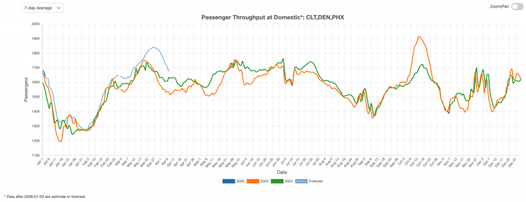 Figure 2 highlights recent travel trends at major domestic hubs, including Charlotte (CLT), Denver (DEN), and Phoenix (PHX). Passenger throughput at these airports generally followed last year’s pattern but exceeded prior-year levels by the end of December. Looking ahead, forecasts for the coming months indicate that this growth is likely to persist.