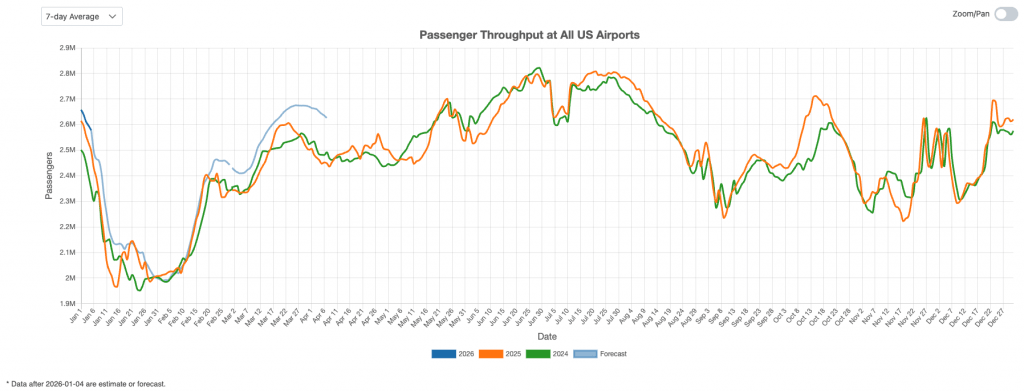 As shown in Figure 1, U.S. airport traffic experienced a brief decline following the Thanksgiving holiday, followed by a rebound to another peak of approximately 2.7 million passengers per day toward the end of the year. Current forecasts indicate that passenger volumes are expected to remain roughly 3% above 2025 levels in the near term.