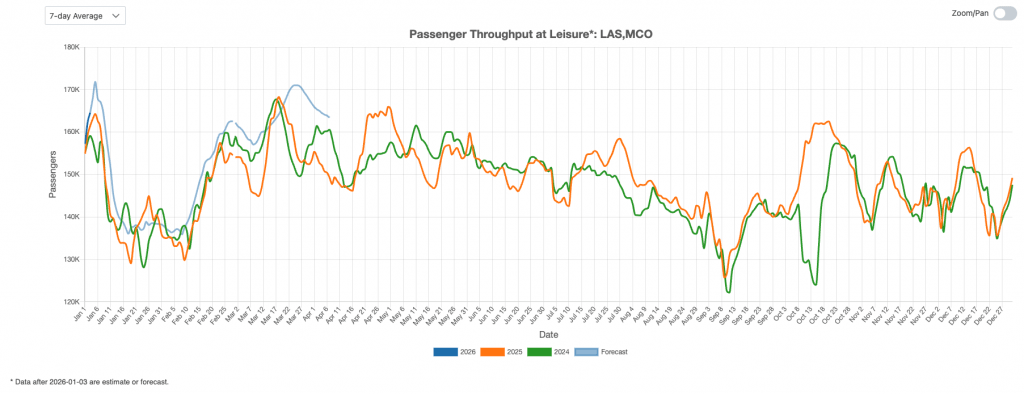 Figure 4 provides an overview of U.S. leisure air travel trends. Passenger volumes in December 2025 closely mirrored 2024 patterns at leisure-focused airports such as Las Vegas (LAS) and Orlando (MCO). Looking ahead, forecasts indicate that leisure traffic may reach new highs in the coming months, with a seasonal peak expected shortly after New Year’s Day.